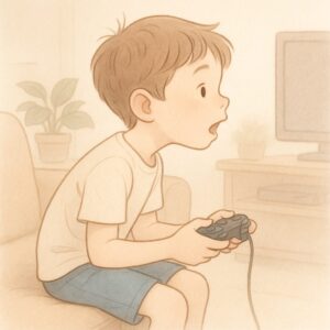 私の息子も以前はゲーム中に前のめりになって呼吸が浅くなっていました。少し意識して姿勢を整えるように声掛けをしたところ、口が自然に閉じられるようになったのを覚えています。