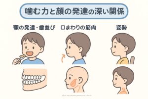 - 噛む力が弱いと、姿勢が不安定になりやすく、集中力や体の動きにも影響する可能性があります。