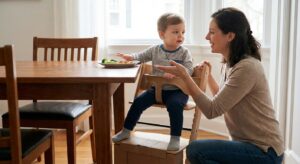 対策: 食事の直前までテレビを見せるのではなく、食卓の準備を手伝ってもらったり、軽い手遊び歌をしたりして、「動」から「静」への切り替えスイッチを意識させます。日中に「ハイハイ遊び」や「ぶら下がり遊び」を取り入れ、体幹の基礎力を高めておくことも有効です。